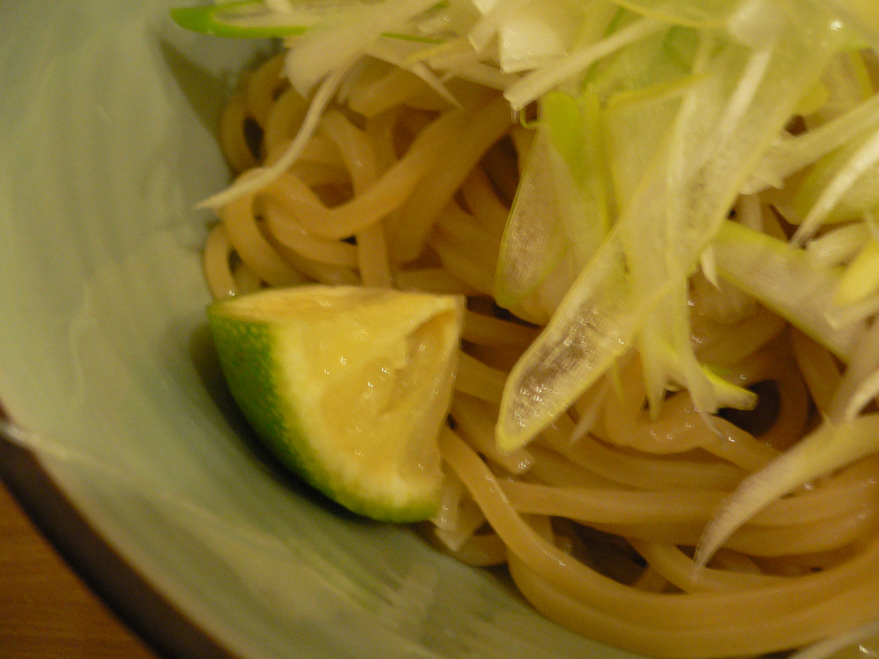 麺側にかぼす(?)が付いてきて、酸味を補うこと。