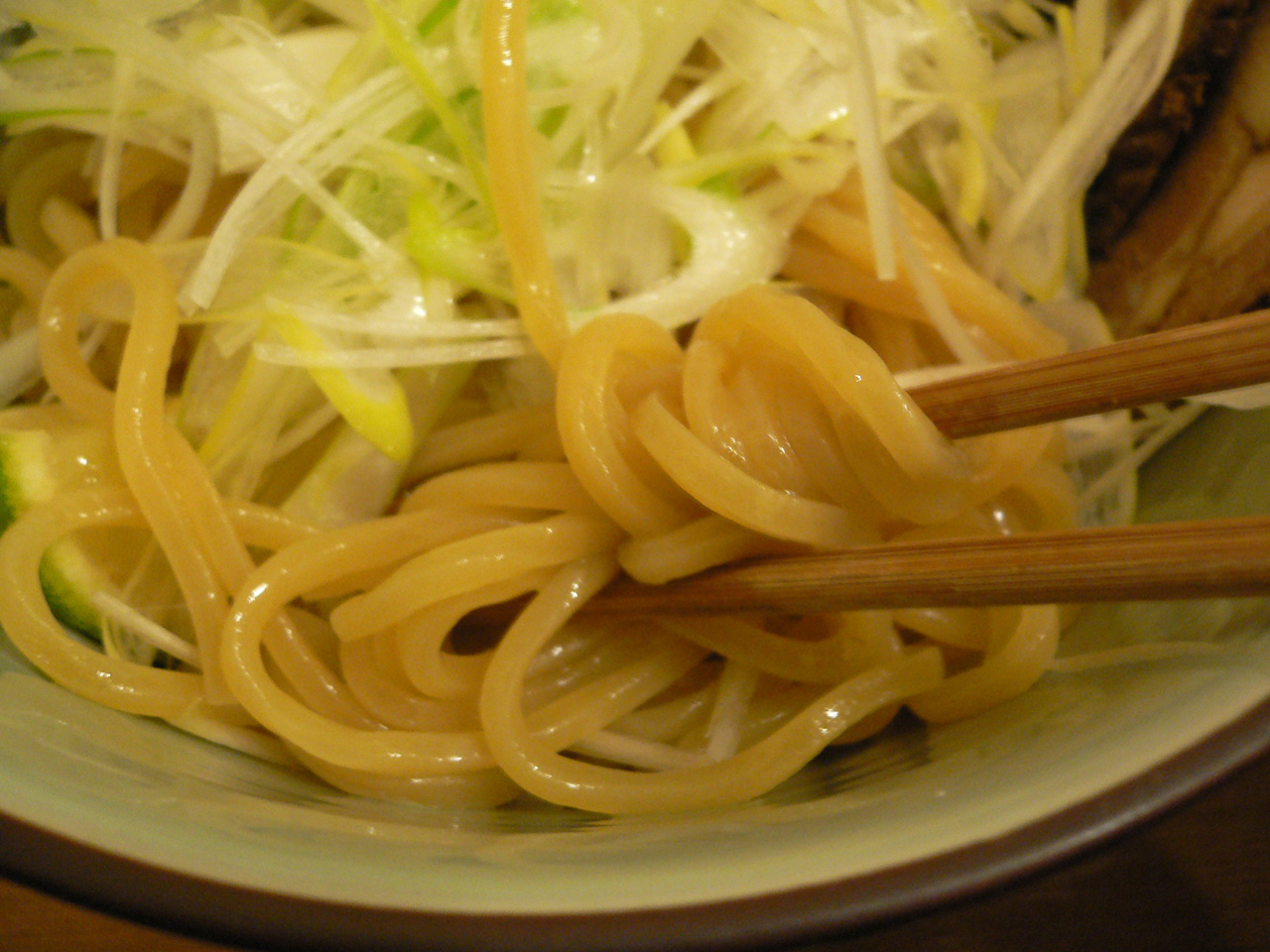 ツケダレを冷ます犯人の一つであるも、鮮烈な印象を与える大量のネギ。