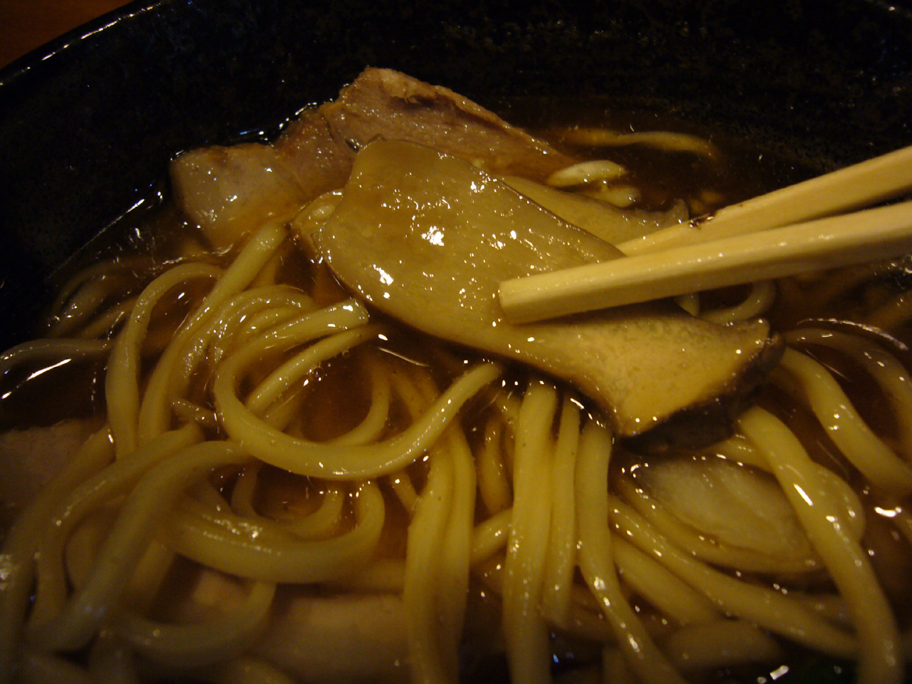 スープは魚介系の香りとエリンギから来るキノコの風味もあって、表面の油が強めにも関わらず、あっさりとした印象すら与えてくれます。