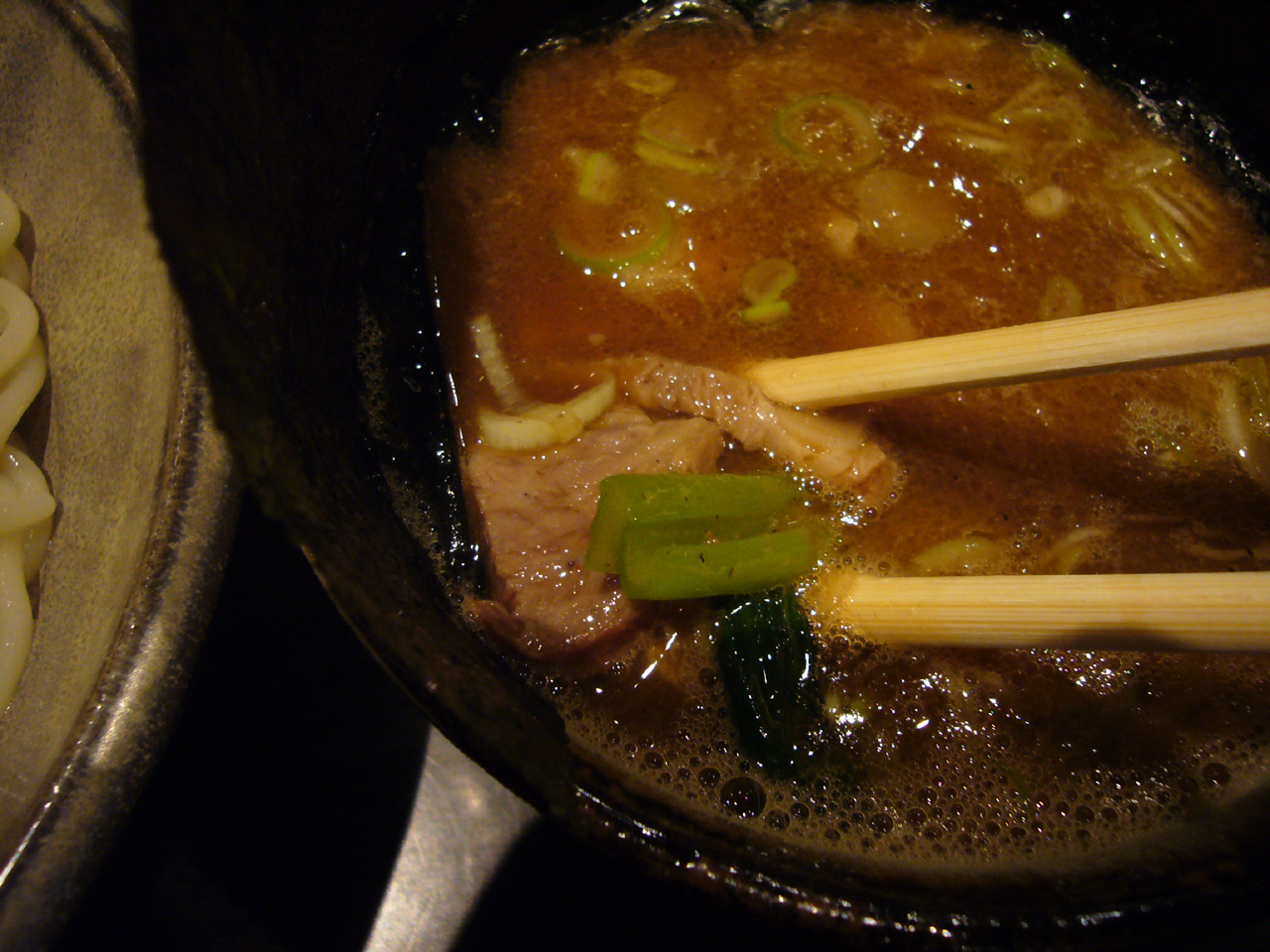 つけ汁は旨味が強く、醤油味も濃い。太麺との相性は...
