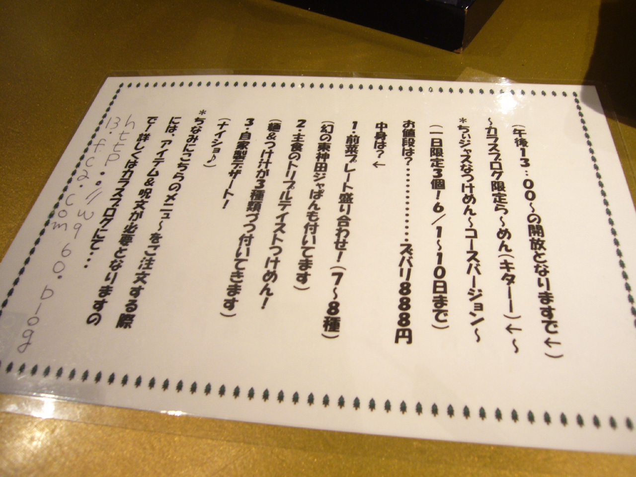 来てから気付きましたが、老舗製麺所・浅草開化楼の名物営業担当さんのからす氏のブログ読者限定メニューがあるんでした。