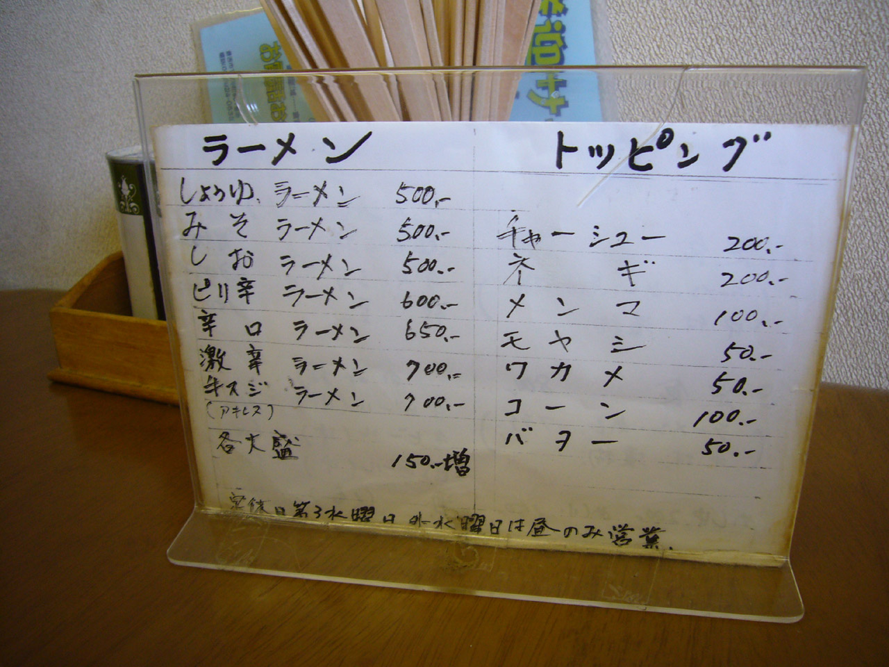 メニューはしょうゆ、しお、みその各ラーメンにピリ辛、辛口、激辛のからそうなラーメンに、牛スジラーメン。