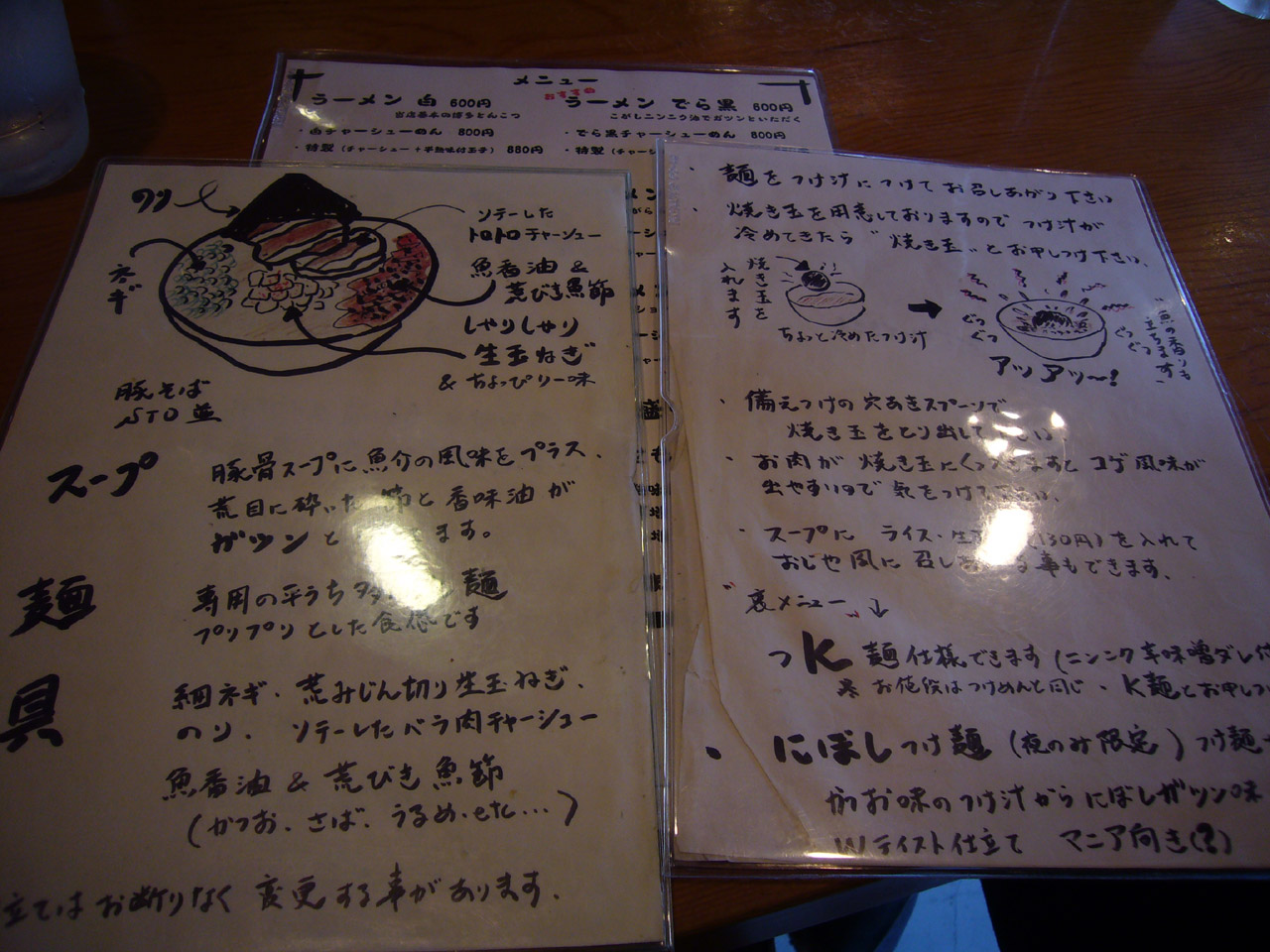 メニューはお目当てのカレーまぜそばは既に無く、博多とんこつのラーメン白、こがしにんにく油のラーメンでら黒、背脂たっぷりのラーメン特濃、とうがらしミンチのラーメン赤、まぜそばに黒コショーの効いたラーメン黒に焼き玉つけめ