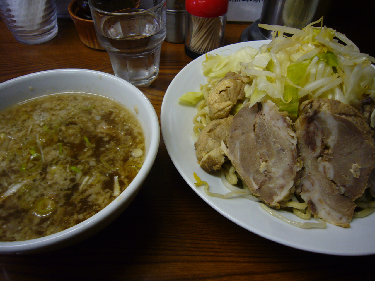 ちょっと迷ってつけラーメンに豚。もっと迷って大盛に。