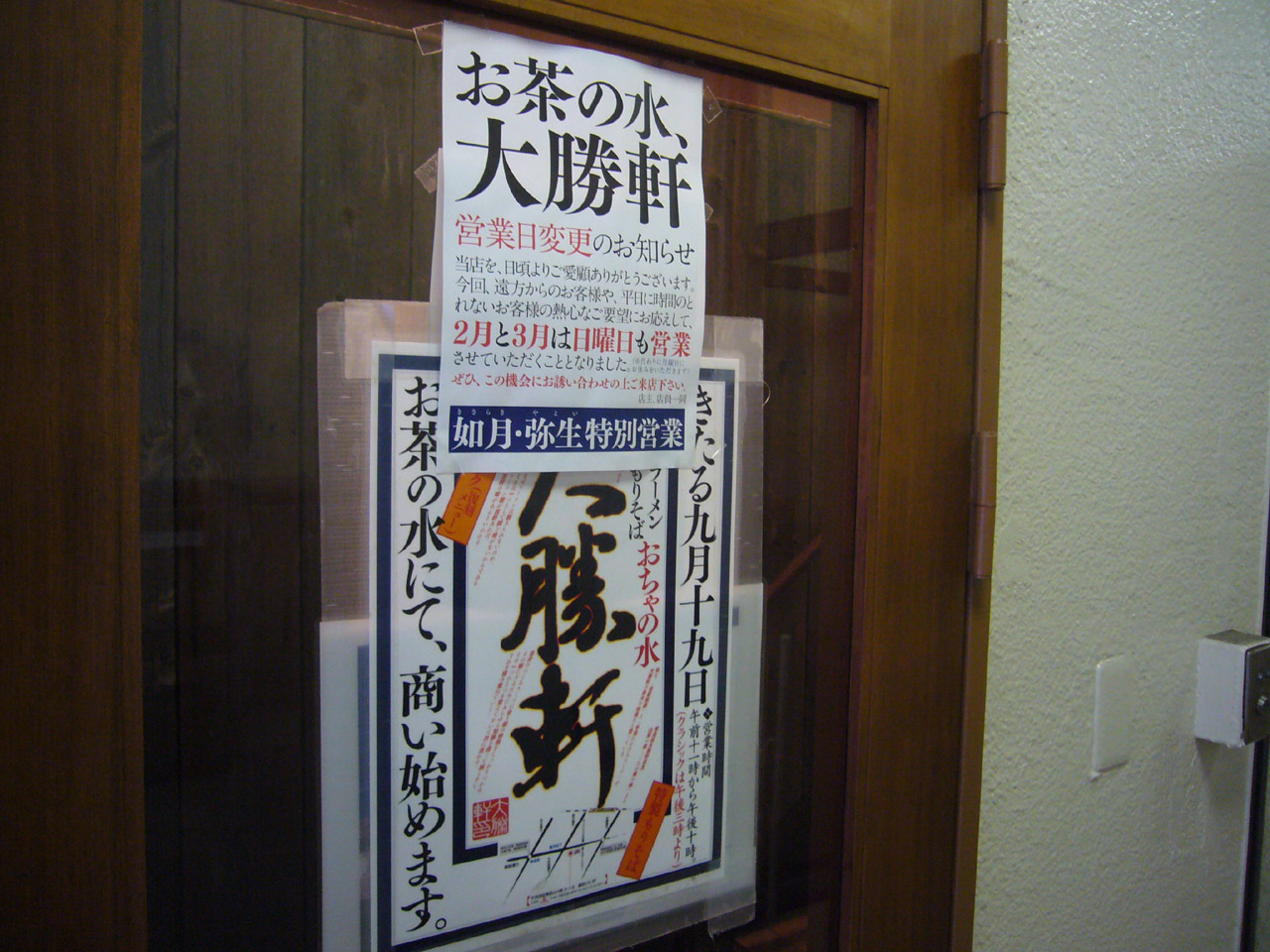 さて、今回は「超らーめんナビ」の「今やっているお店検索」が定休日に対応してないのをまんまと見逃して(笑)、日曜日の神保町というなんとも代替の効かない場所に来てしまったものの、たまたま2月と3月は日曜も営業していた「お茶の水大勝軒」へやってきました。ありがたや。