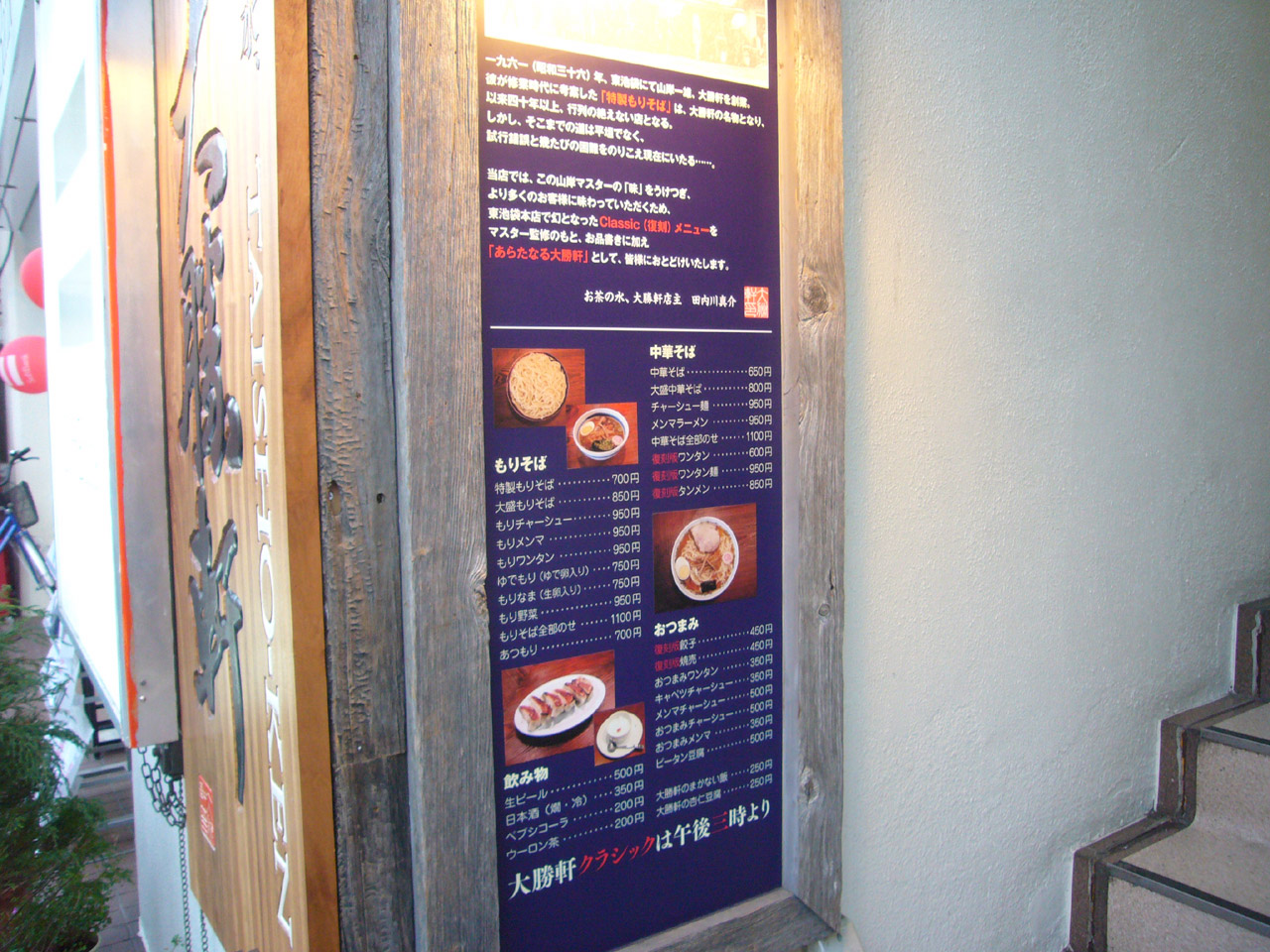 「メニューは15:00以降はクラシックメニューらしく、復刻版ワンタンメンや復刻版タンメンなどといった、かつて東池袋大勝軒で出していたメニューを出しています」