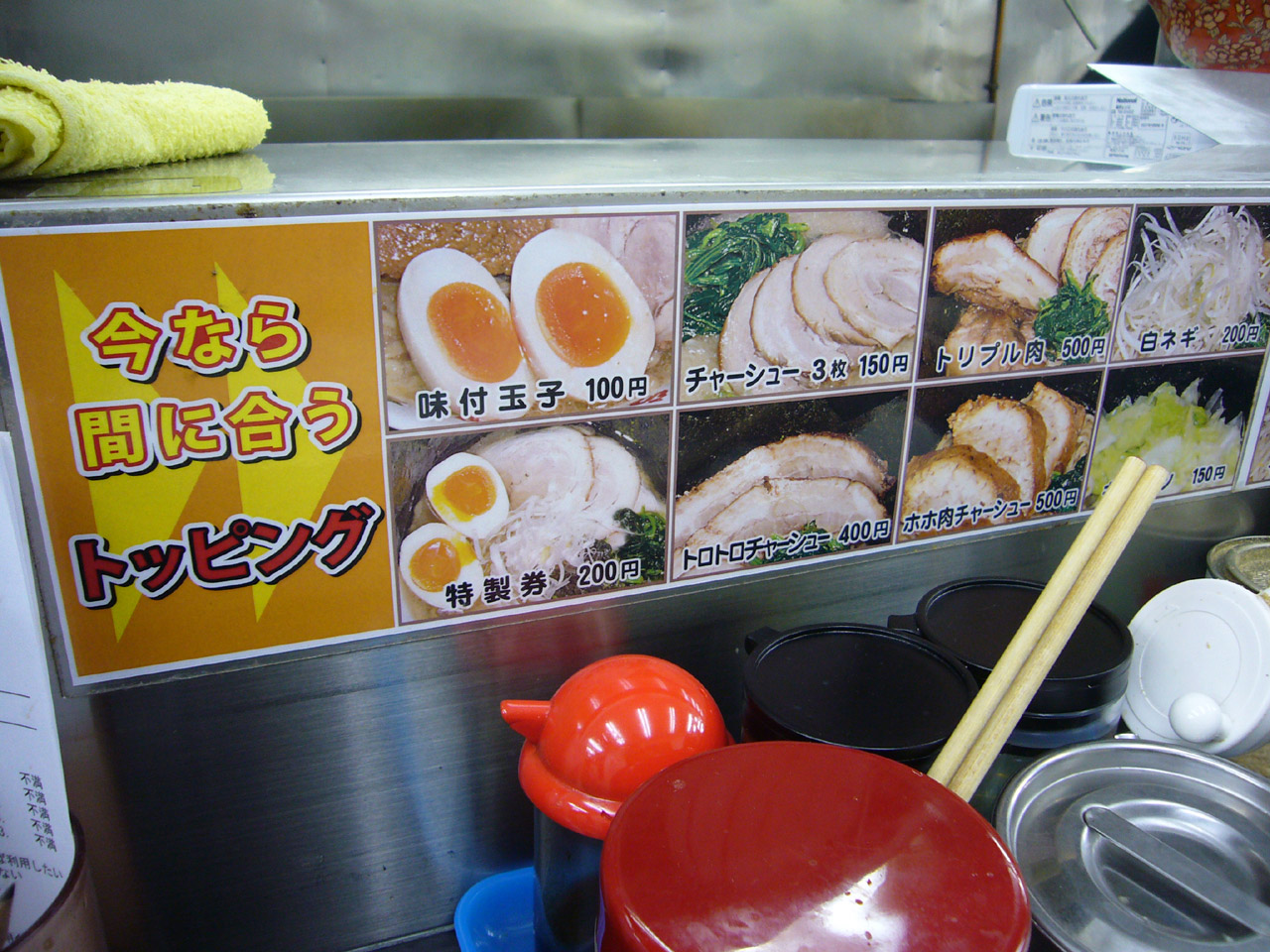 カウンターの「今なら間に合う」と書かれたトッピングメニューが巧いなぁ、と。