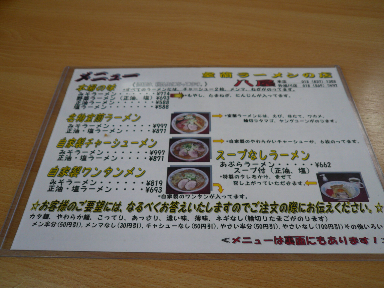 メニューは、本場の味「ラーメン」、「名物室蘭ラーメン」「自家製チャーシューメン」「自家製ワンタンメン」があって、それぞれ味噌、正油、塩とあります。