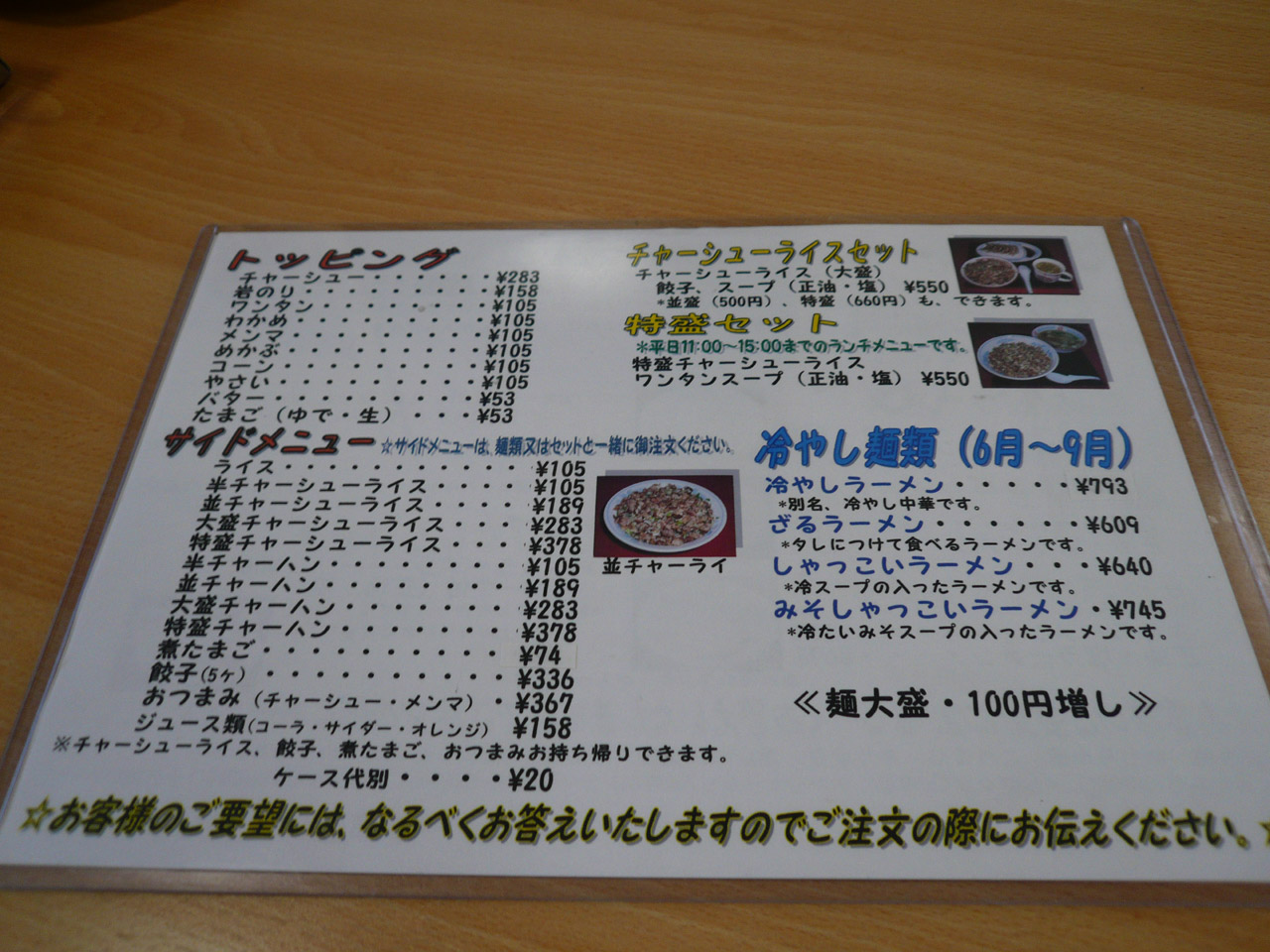 またあぶらラーメンや正油と塩の「野菜ラーメン」、夏期は「冷やしラーメン」「ざるラーメン」「しゃっこい(秋田弁で冷たいの意)ラーメン」「みそしゃっこいラーメン」なんてのもありまして、あとはサイドメニューのチャーシューライスが名物っぽいです。