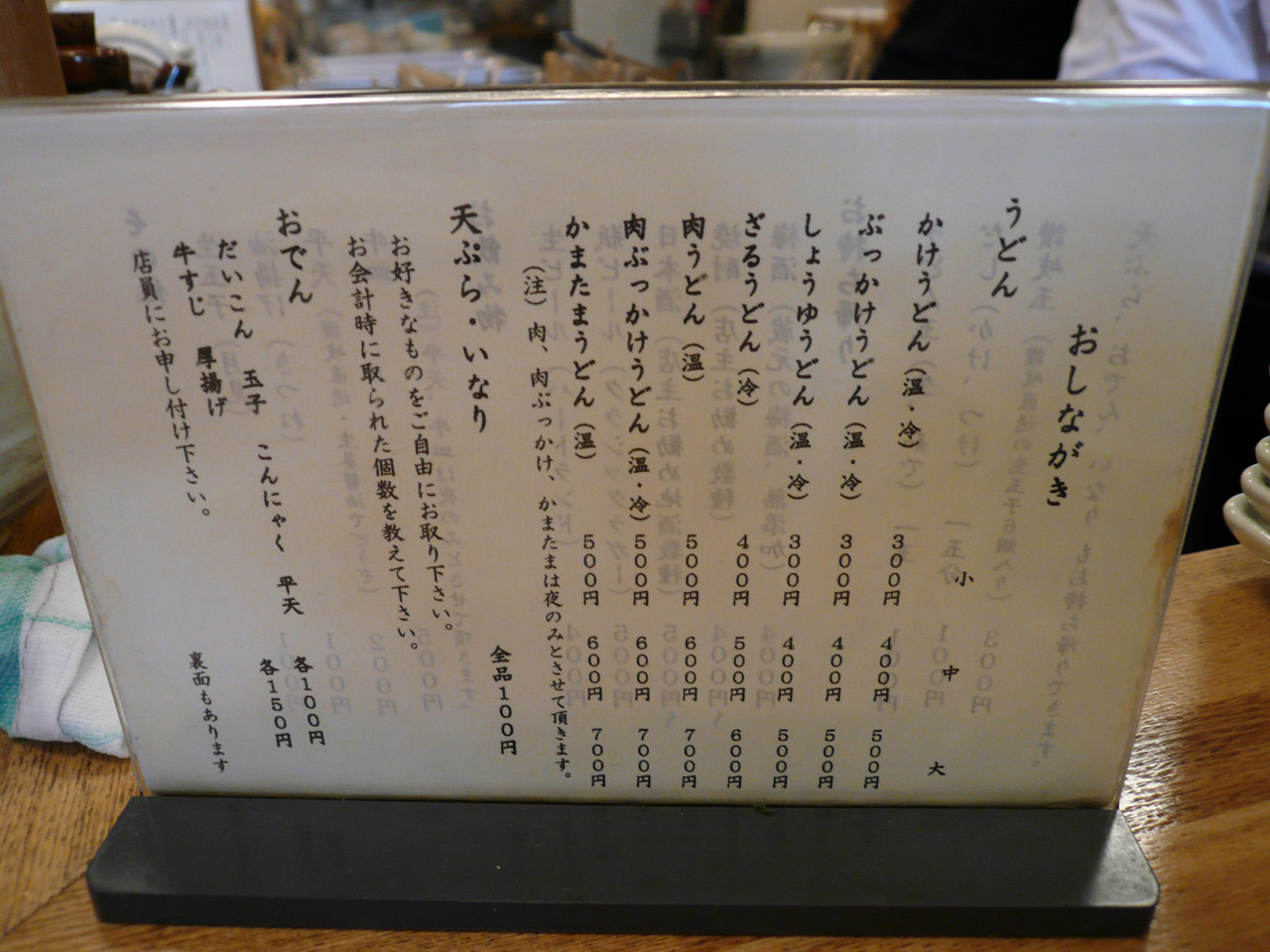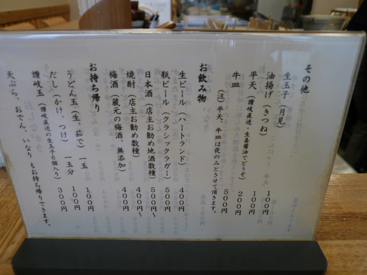 メニューは、かけ、ざる、ぶっかけ、生醤油、肉、肉ぶっかけ、カレー、かまたまなどなど。