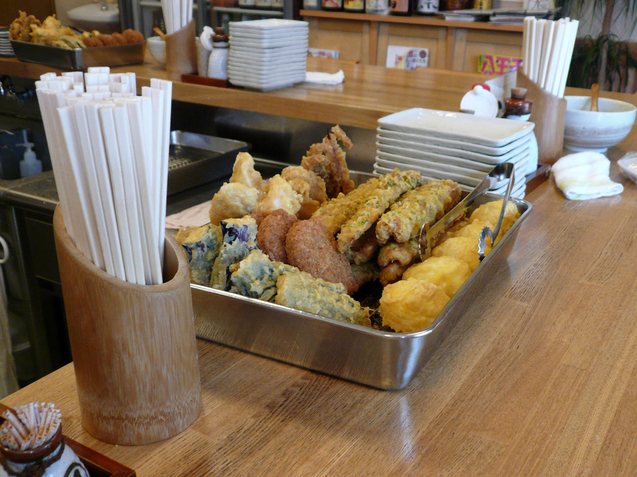 天ぷらは金属のバットに入っているものを、いなり寿司はお皿に載っているものを自分で取って、最後に精算する時に自己申告するシステム。