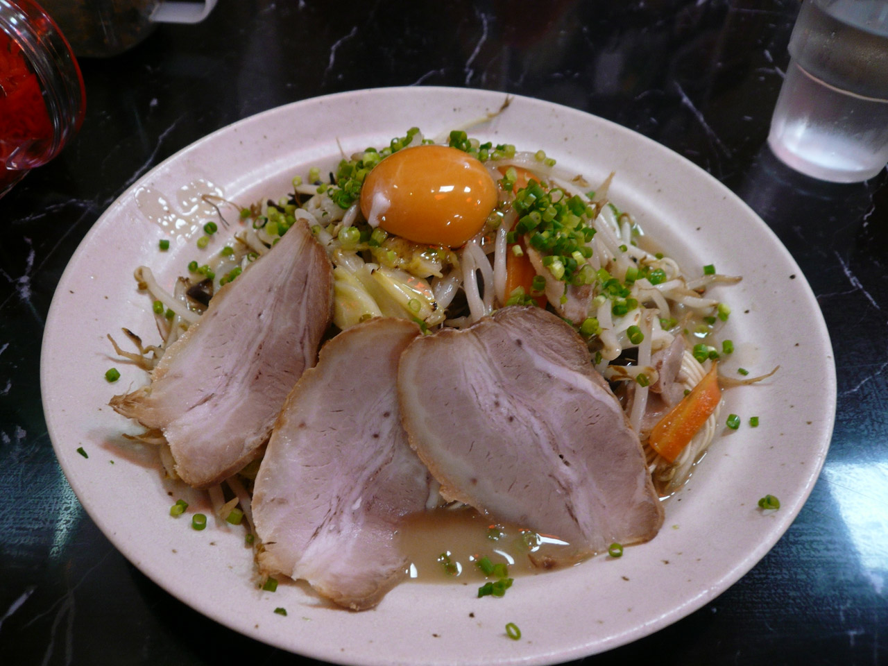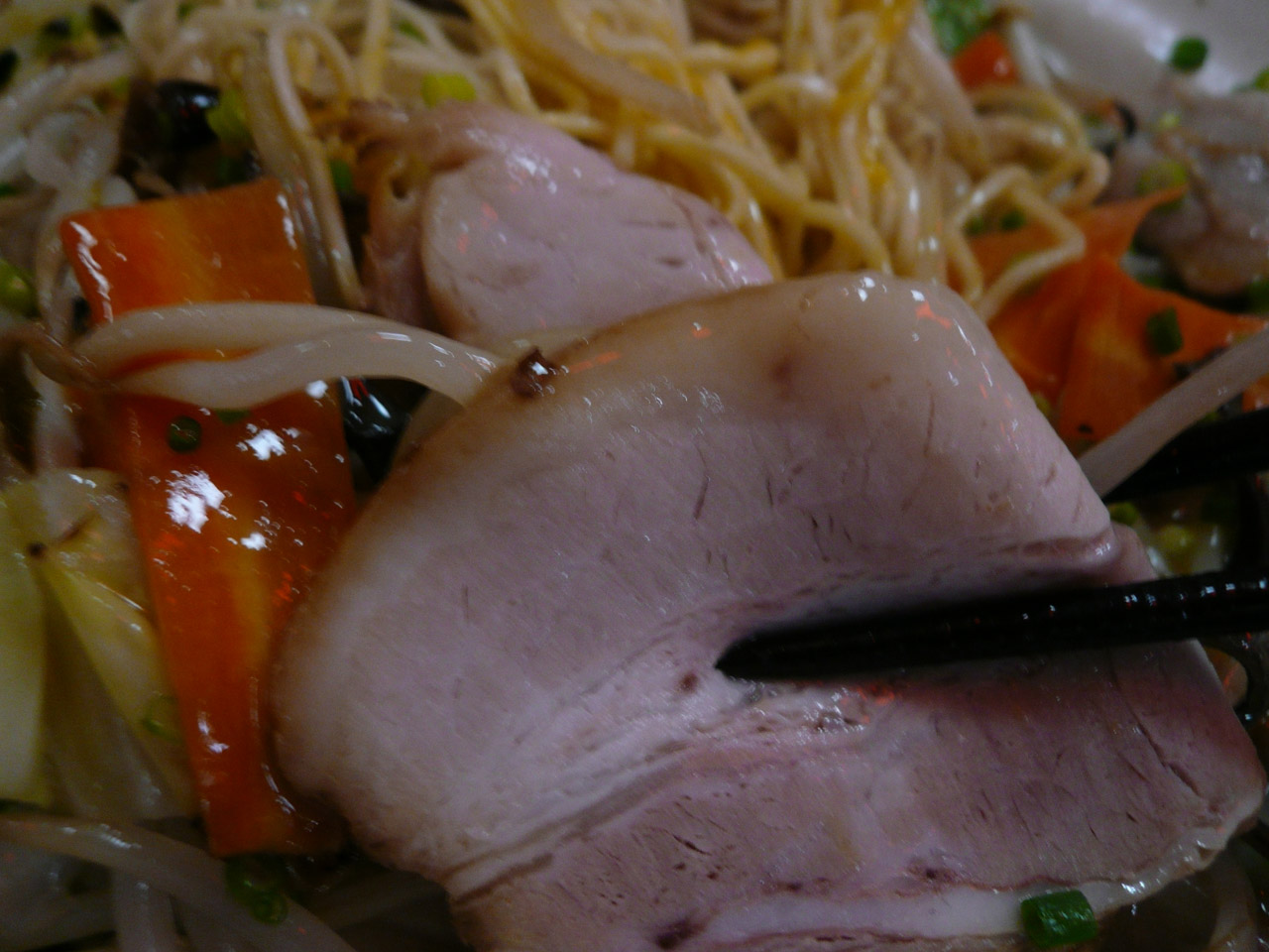 チャーシューの他に、モヤシ、キャベツ、ニンジン、キクラゲなどが入っていて、これらは麺とともにサッと炒められているんですね。