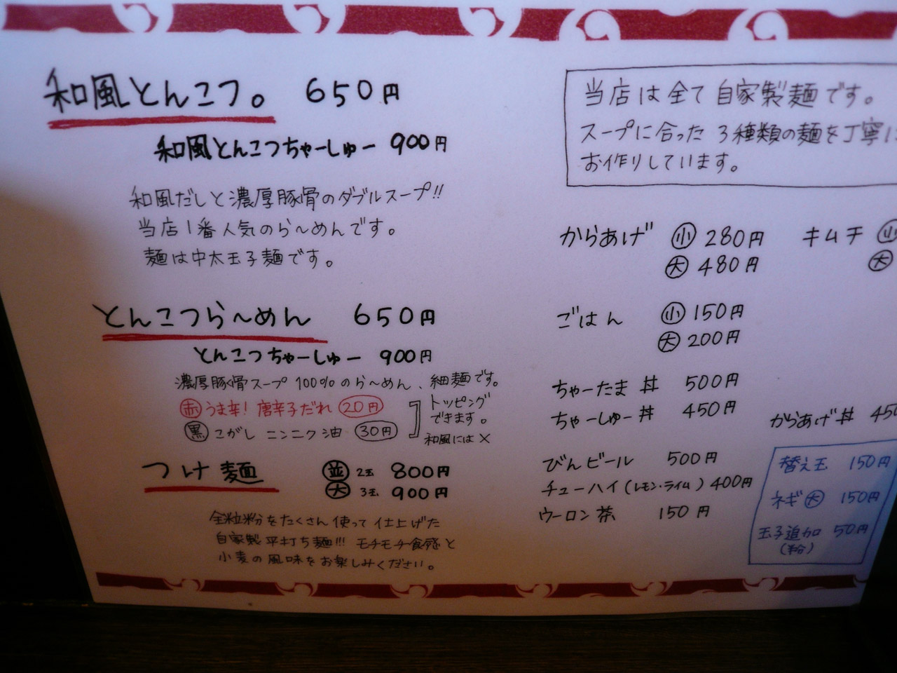 メニューは和風とんこつ、とんこつ、つけ麺の3ラインを中心に。