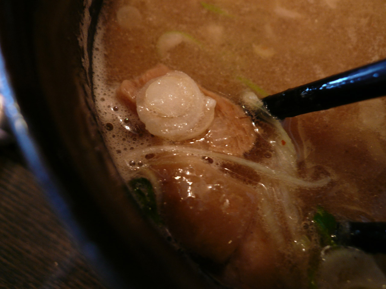 ちょっとレアっぽいチャーシューなどが麺側に載っています。