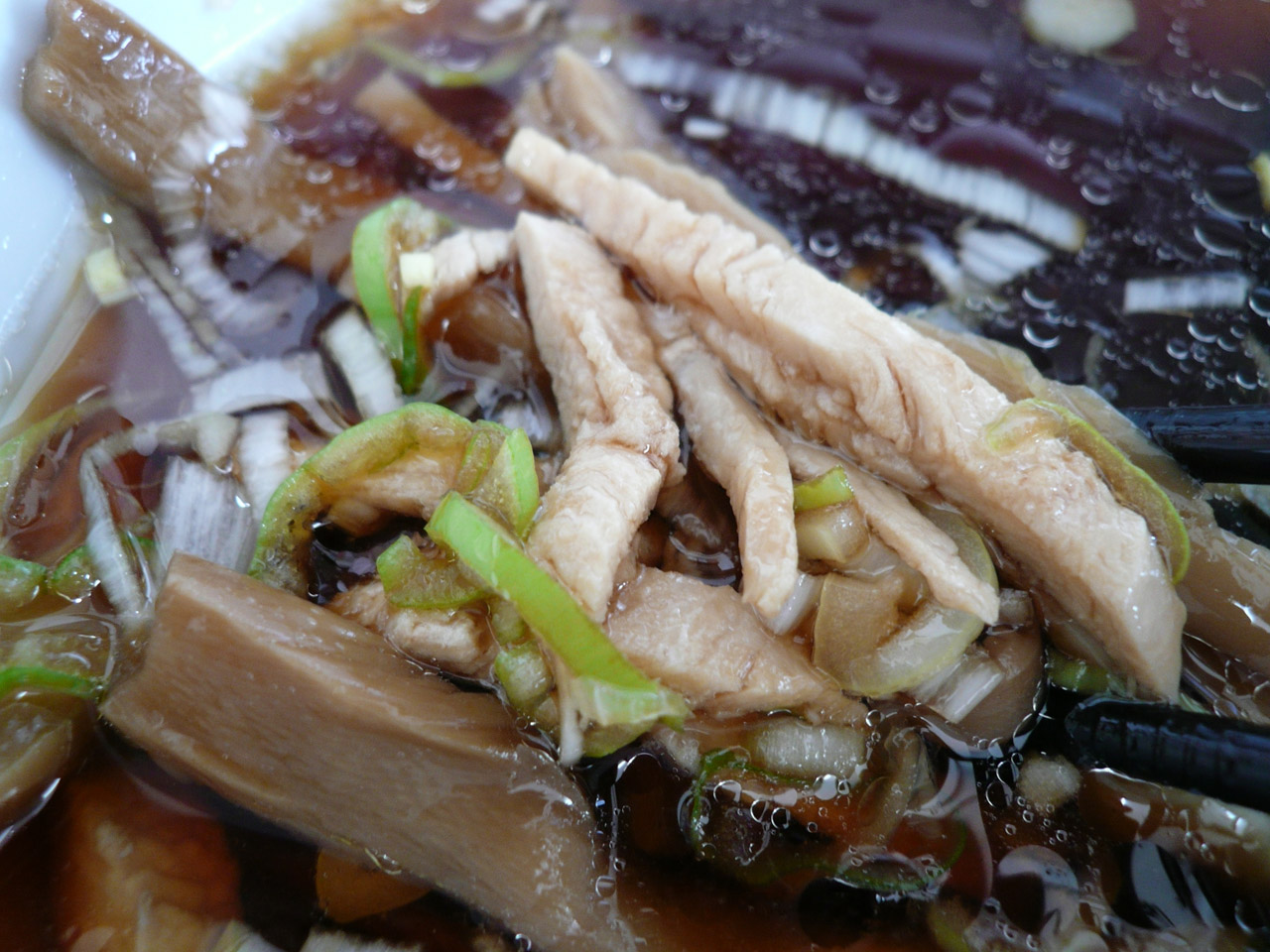 表面に油が多めに合って、酢と醤油が強いツケダレです。