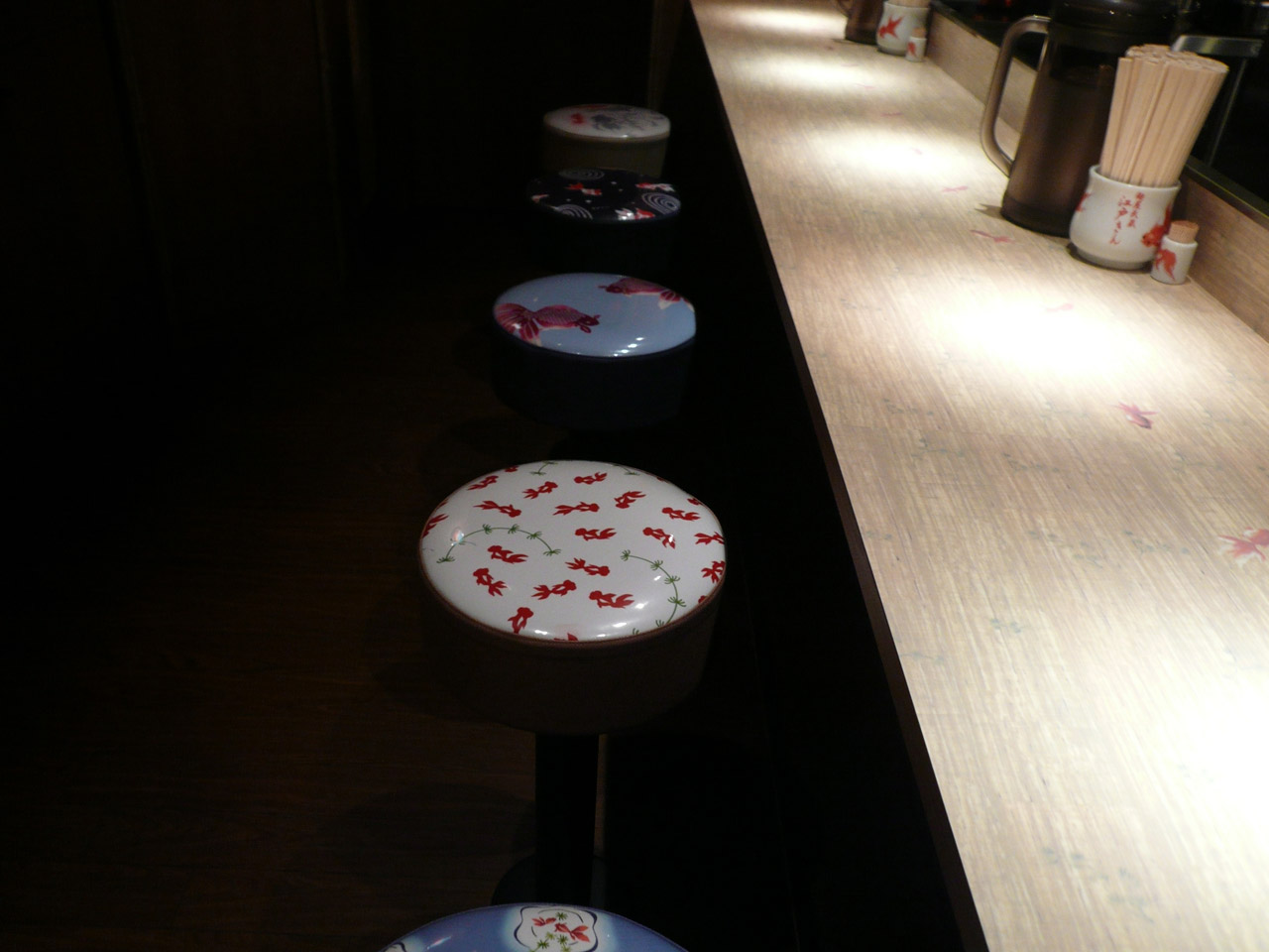 椅子やカウンター、箸立てに金魚の絵。