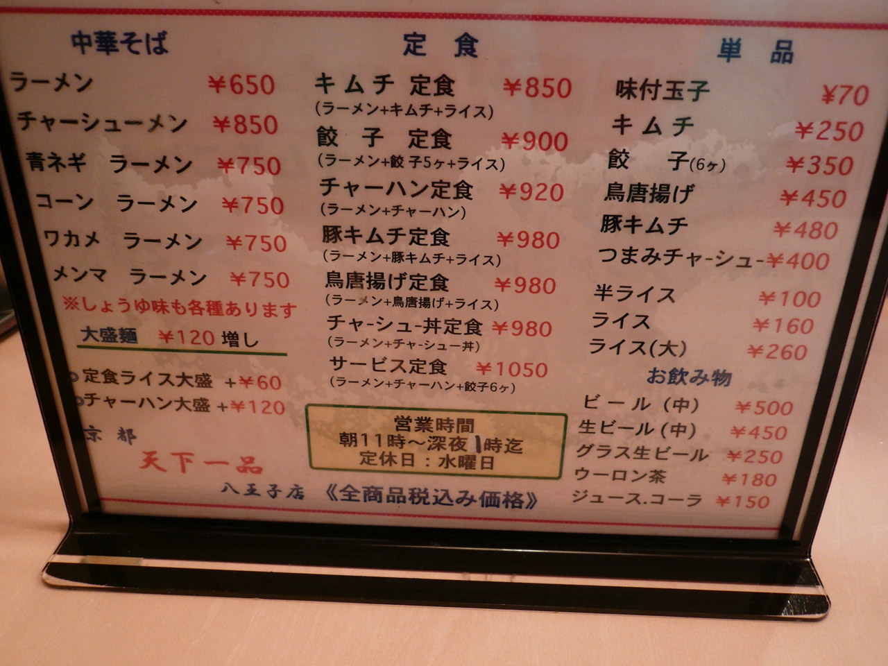 というわけで、八王子の天下一品に平日の15:00ちょいすぎに訪問。