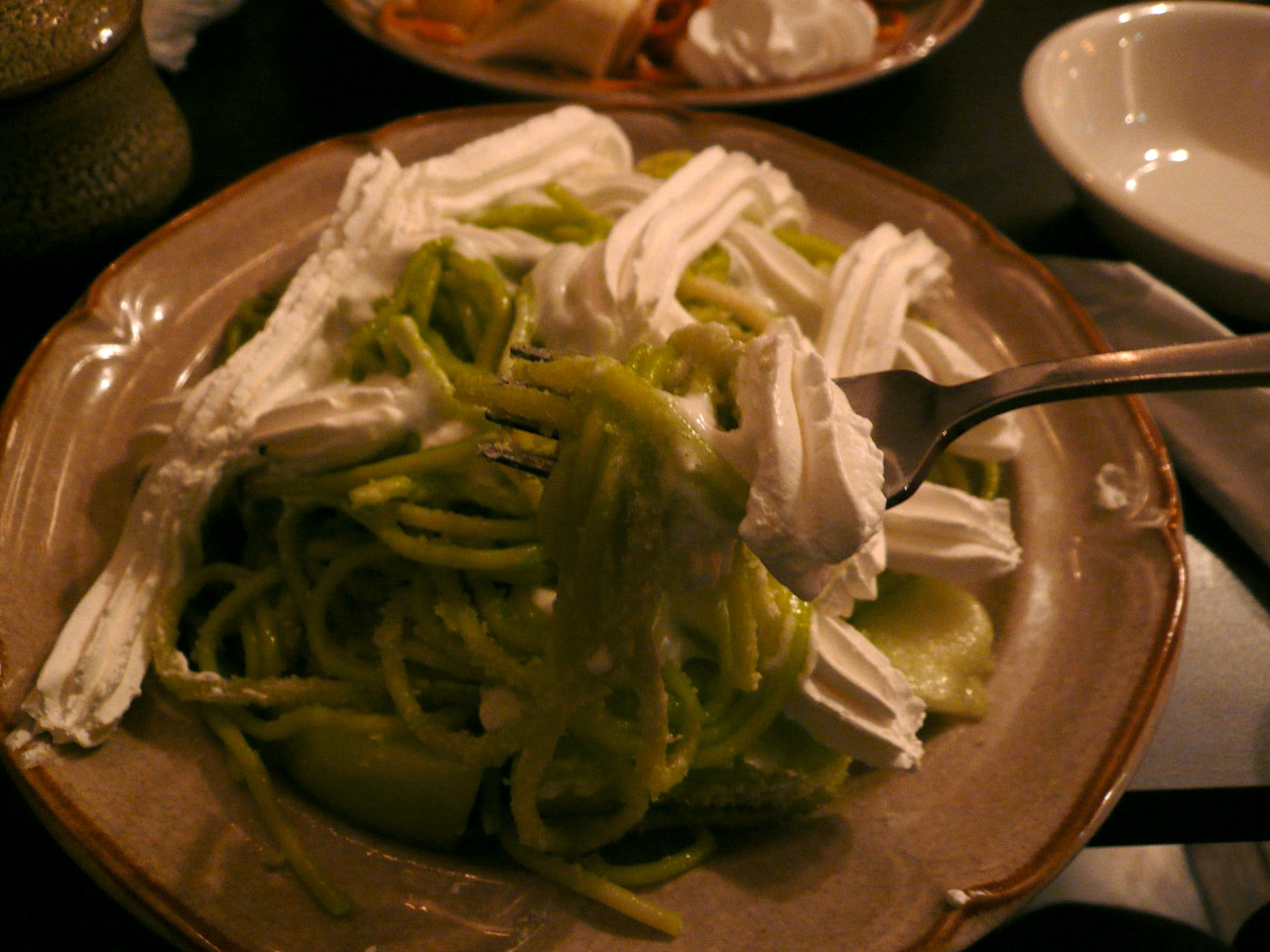 緑色のパスタに生クリーム、メロン、何らかのパウダーが載っています。