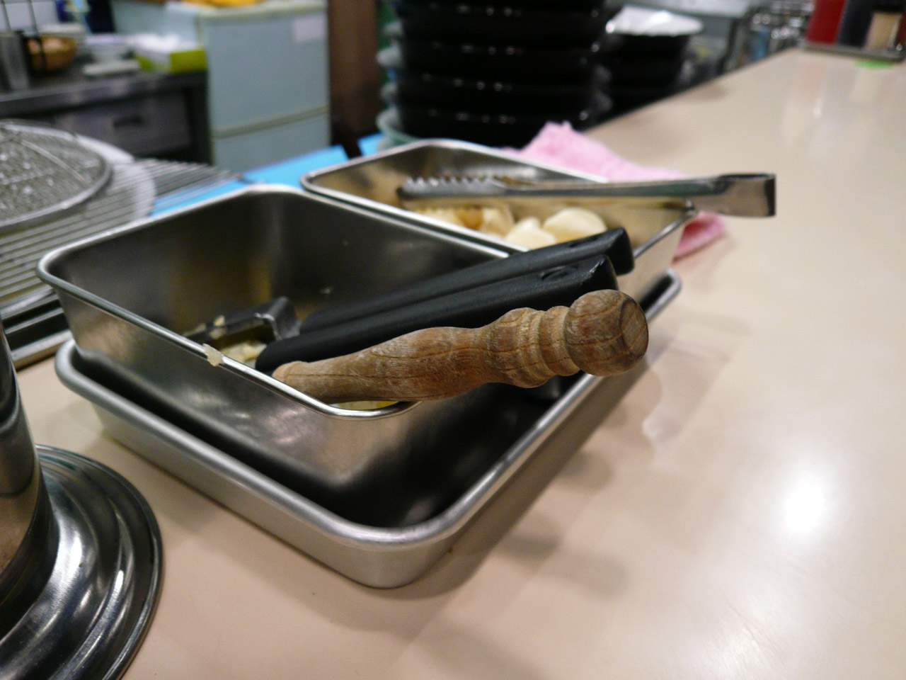 まずは、卓上のニンニククラッシャーでニンニクをクラッシュして頂きます。