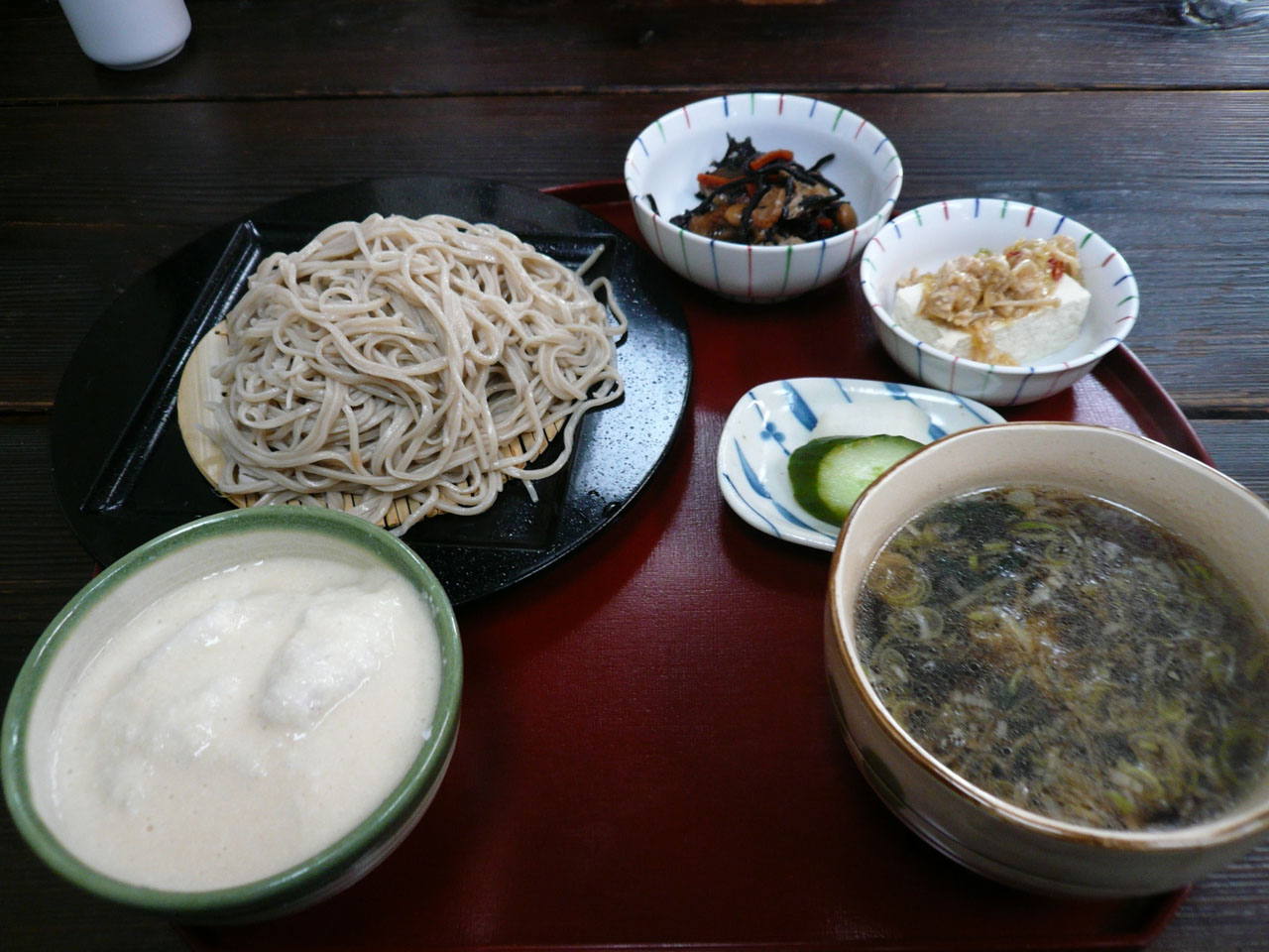 この日のランチは「鴨かきつねの蕎麦かうどん」に「麦とろ飯」「小鉢2品」「香の物」のセットで750円。