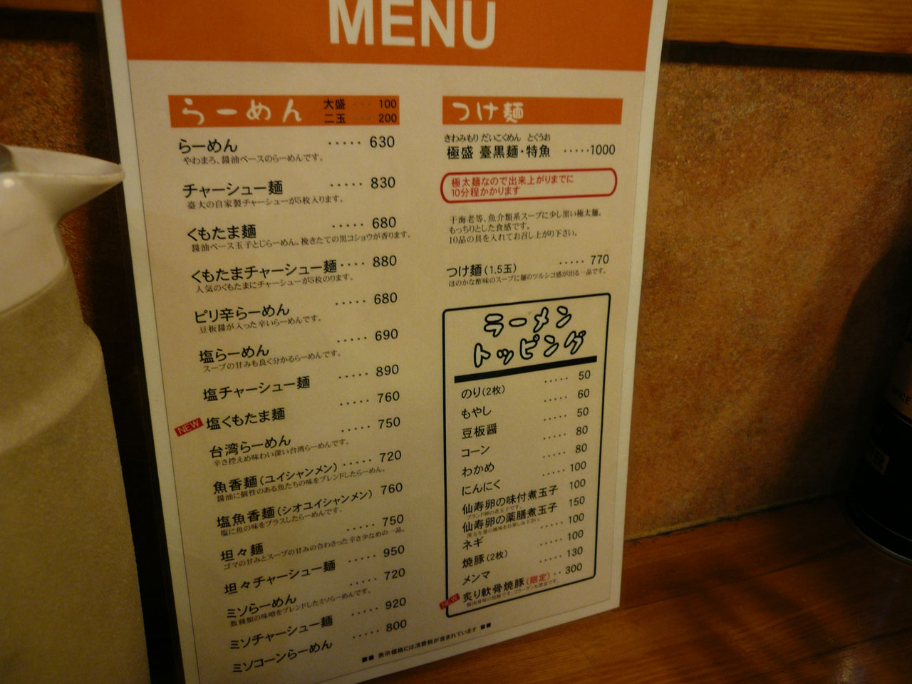 メニューはなかなか豊富で、らーめん、塩らーめん、ミソらーめん、台湾らーめん、担々麺、魚香麺、塩魚香麺などなど。