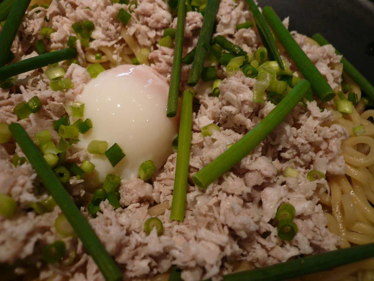 ほぐし肉の中心部に温玉、麺の下の方にトロミのある冷たいカレーが、入っていて、混ぜて食べるというスタイル。