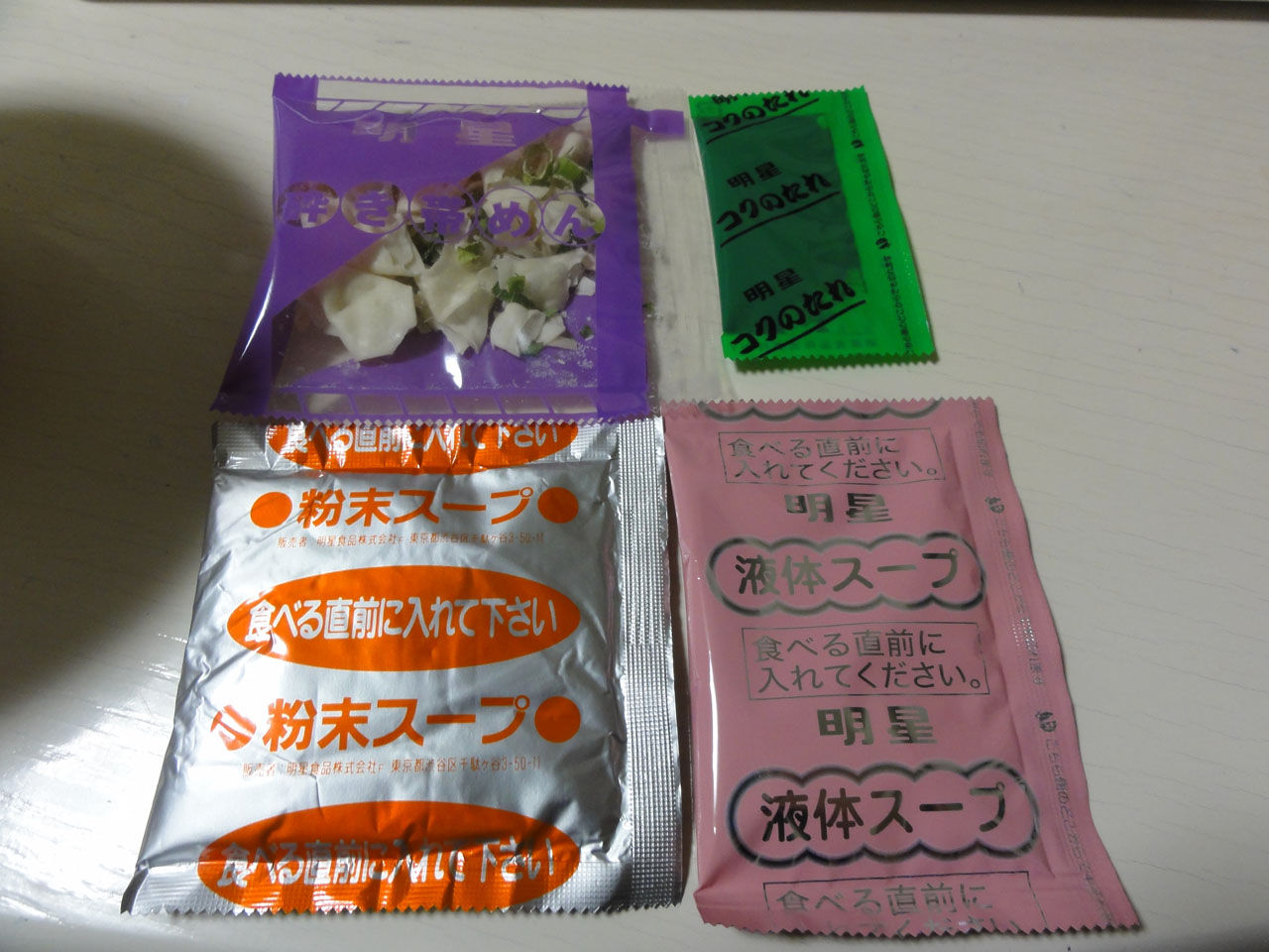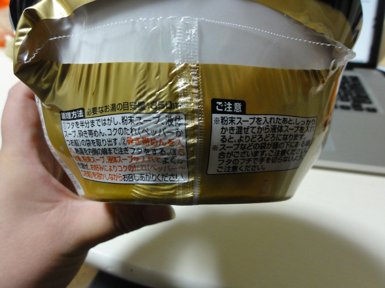 えーと、お湯を入れる前に入れるのは帯麺だけで、5分経ったら粉末スープを入れてかき混ぜたら、液体スープを入れて、最後にペッパー鰹あんを入れる…と。